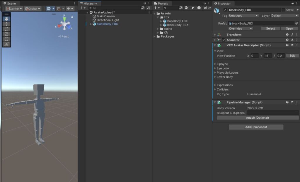 販売アバターではこれらが全て組みあがっていてすぐにVRchatにアップロードできるものが多いと思います。私のアバターもunitypackageを読み込んだこちらのデータが、すぐにアップロード可能な状態のデータです。